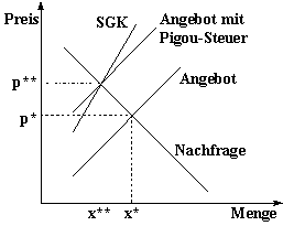 senkt die Angebotsmenge von x* nach x**, da die ursprüngliche Angebotskurve sich in Höhe der Pigou-Steuer parallel nach oben verschiebt, wodurch der Preis p* auf p** steigt. Die neue Angebotskurve schneidet die Nachfragekurve aufgrund der Ausgleichsfunktion der Pigou-Steuer in dem Punkt, wo die soziale Grenzkostenkurve (SGK) auf beide trifft,23 da sich die Höhe des Steuersatzes aus der Differenz von privaten und volkswirtschaftlichen Grenzkosten (soziale Grenzkosten) ergibt.24 Ein einzelunternehmerischer Vergleich zwischen diesen sozialen Grenzkosten und den Grenzvermeidungskosten bringen den Emittenten dazu, ein pareto-optimales Umweltniveau anzustreben, bei dem die Grenzkosten der Vermeidung (GVK) gerade so hoch sind, wie die externen Grenzkosten (Gkext) bzw. Grenzschäden.25 Abbildung 3 verdeutlicht diese Lenkungsfunktion einer Pigou-Steuer (t0), durch die das Verhalten |