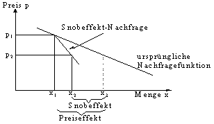 Verbände des ökologischen Landbaus, die ein Verbraucherinteresse an ihren Bioprodukten pflegen wollen, müssen sich mit strengeren Richtlinien und/oder steigenden Werbemaßnahmen für ihren Verband hervortun,30 um einerseits ihre Mitglieder zu halten und auch um ihren Bioprodukten einen neuen Nischenmarkt zu öffnen. Der einzige Verband, dem es gelungen ist, für sein Warenzeichen eine besondere Wertschätzung bei bestimmten Bevölkerungsgruppen zu erzielen, ist Demeter. Für dieses Zeichen lassen sich in Naturkostläden und in Reformhäusern allgemein höhere Preise erzielen.31 Die bisherigen Kunden von Reformhäusern und Naturkostläden benötigen Bioprodukte, die ihren hohen Preis gegenüber Produkten mit dem Öko-Prüfzeichen durch besondere Rahmenrichtlinien rechtfertigen. Beim Demeter-Verband ist es die biologisch-dynamische Landwirtschaft, andere Verbände könnten sich auf Richtlinien bei der Tierhaltung, wie auch Maßnahmen bei Produktion und Verarbeitung spezialisieren, die einen besonderen Genußwert garantieren.32 Im Grunde ist der Snobeffekt (siehe Abbildung 14) des ökologischen Konsums neu zu definieren. x1 bezeichnet die Menge an Konsum, der noch toleriert wird, ohne daß sich die Ökopioniere durch den Massenkonsum frustriert fühlen. Erfolgt nun eine Preissenkung von p1 auf p2 und kommt es infolgedessen zu einer größeren Nachfrage schränken diese ihre Nachfrage ein oder ziehen sie ganz zurück. Was zur Folge hat, daß die Preissenkung nicht den vollen Mengeneffekt x3 bei der Nachfrage erreicht, sondern nur bis auf die Menge x2 steigt.33 Die sich hier zurückgezogenen, Exklusivität suchenden Verbraucher, Differenz zwischen x2 und x3, werden weiterhin eine von der Masse abhebende Qualität suchen. Gelingt es den AGÖL Mitgliedsverbänden nicht, wesentliche Unterschiede zwischen Bioprodukten allein mit Öko-Prüfzeichen gegenüber Produkten zusätzlich mit verbandseigenem Ökolabel zu definieren, sind die einzelnen Verbands-Warenzeichen untereinander austauschbar und durch die Kennzeichnung mit dem Öko-Prüfzeichen überflüssig geworden.34 Es ist aber viel